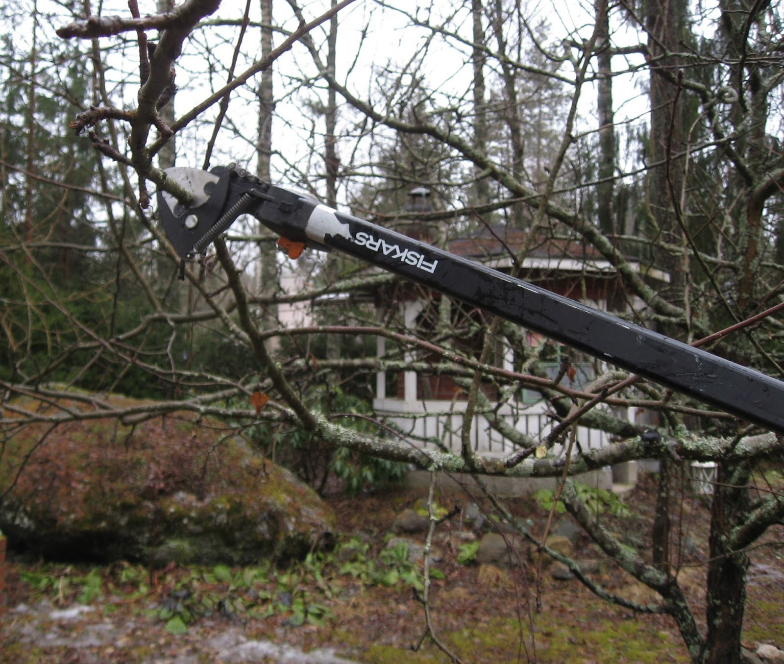 Viikonloppu meni räntäsateen ja vesisateen vaihdellessa. Eilen sitten oli sen verran poutaa, että omenapuiden leikkaus saatiin alulle.
